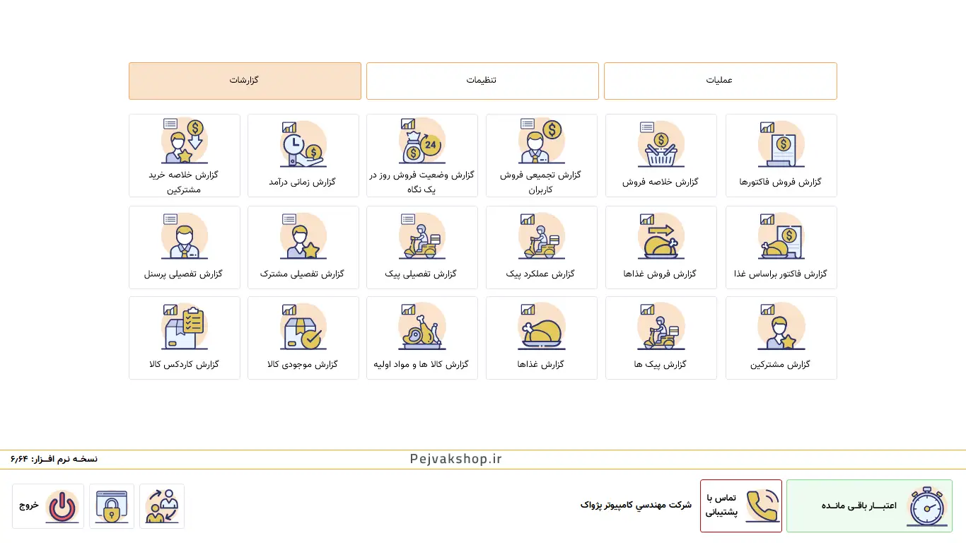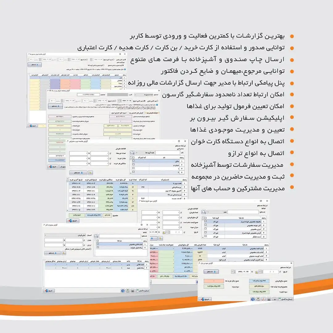 مدیریت حسابهای اشخاص و مشتریان، مدیریت حسابها و موجودی انبار به همراه انواع گزارشهای متنوع در دسترس است تا نظارت کاملی بر عملکرد مجموعه داشته باشید. این ماژولها طوری طراحی شدهاند که پژواک واقعی رفتار خرید مشتریان و موجودی کالا را در گزارشها منعکس کنند.