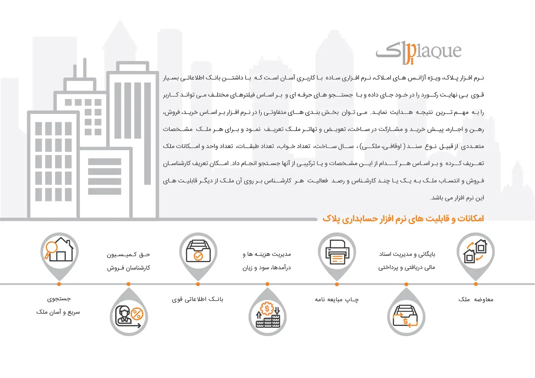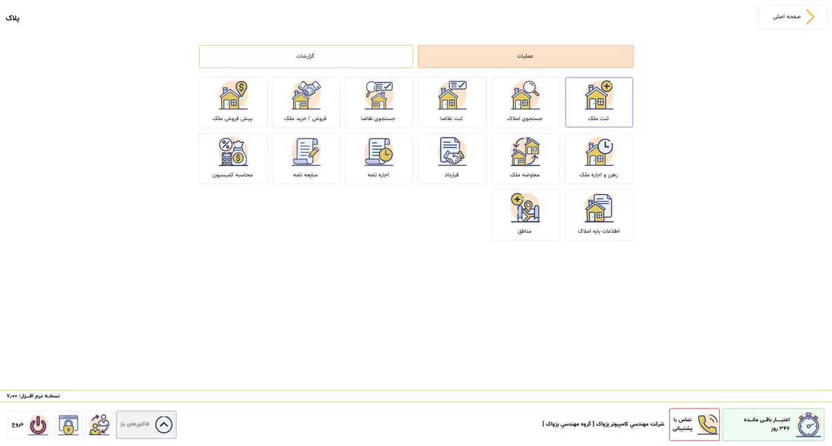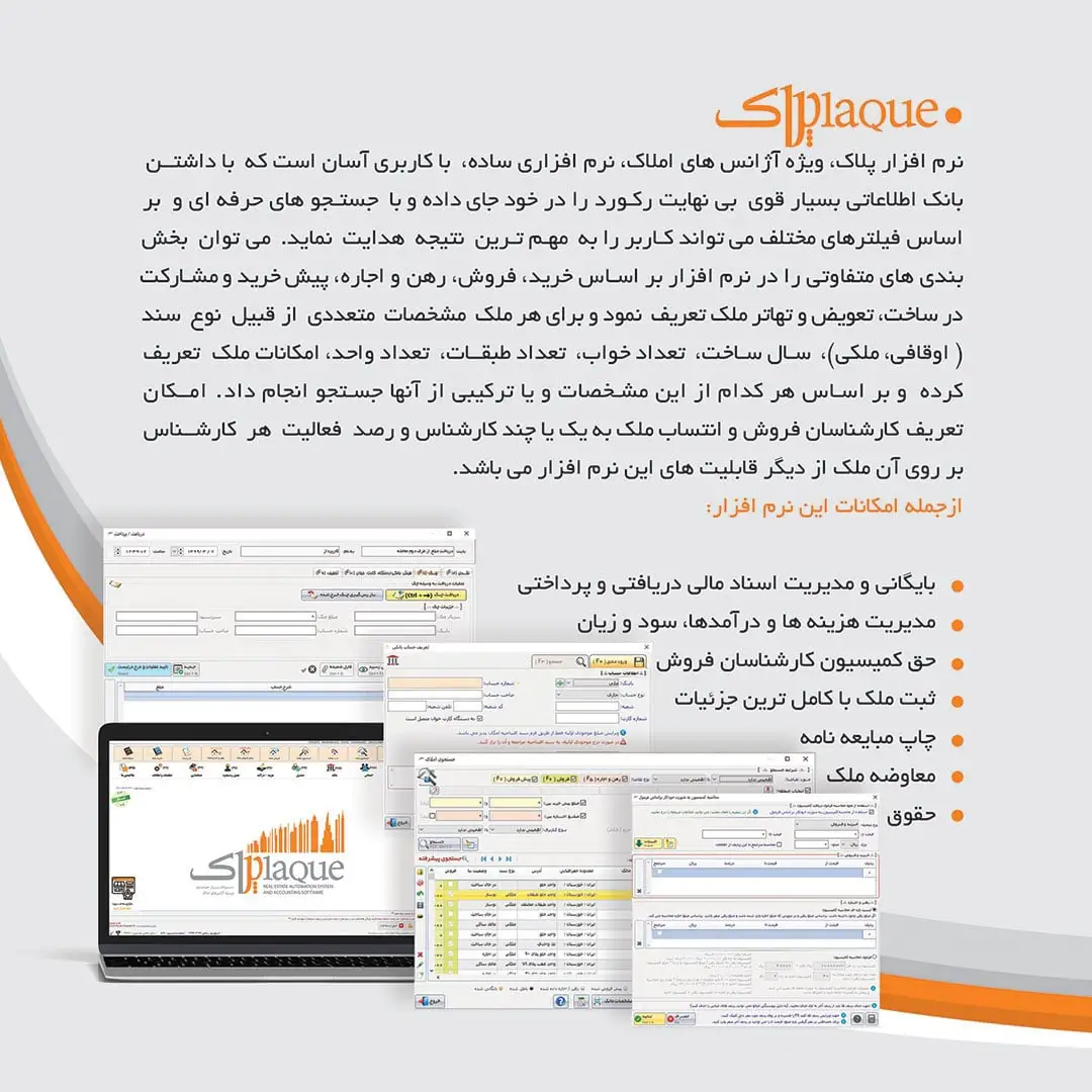 پلاک ویژه آژانسهای املاک است: از فایلینگ سریع و گروهبندی انواع ملک تا چاپ خودکار قراردادها، محاسبه کمیسیون و گزارشهای مالی. این نسخه با تکیه بر امنیت داده و سهولت استفاده، فرایندهای روزمره آژانس را ساماندهی میکند.
