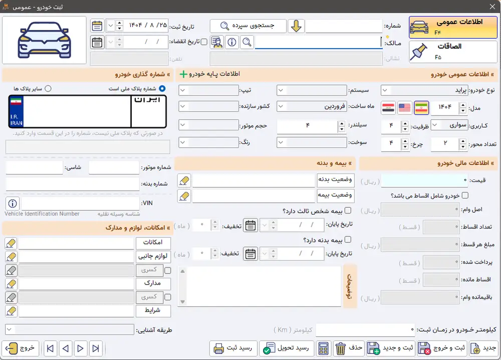 قالب قولنامه و قرارداد با سربرگ نمایشگاه و بندهای سفارشی آماده چاپ (PDF) است. میتوانید اطلاعات خودرو، خریدار/فروشنده، شرایط پرداخت، شماره چکها و پیوستها را آرشیو کنید و با جستجو روی هر فیلد (پلاک، VIN، نام طرفین و...) به پرونده کامل دسترسی داشته باشید.