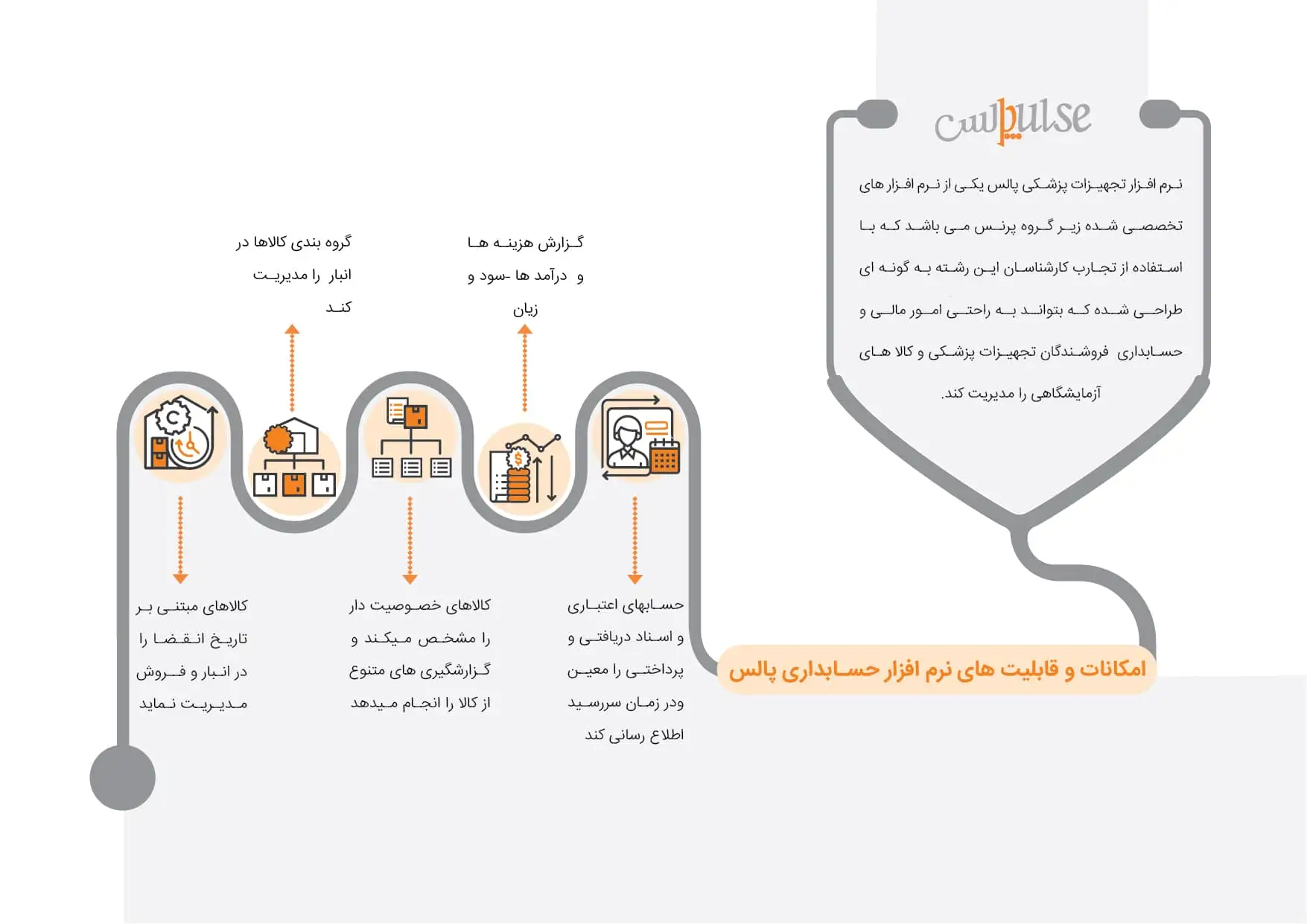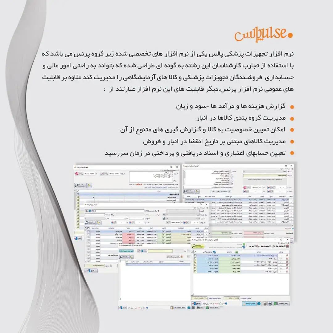 نرم افزار پالس از خانواده نرم افزارهای حسابداری مشاغل پرنس ویژه فروشندگان تجهیزات پزشکی طراحی شده است .این نرم افزار همانند نرم افزار پرنس با طراحی ساده و دقت و سرعت بالا ،به شکلی پیاده سازی شده است که بدون پیش نیاز علم کامپیوتر و حسابداری بتوان به سادگی با آن کار کرد .
