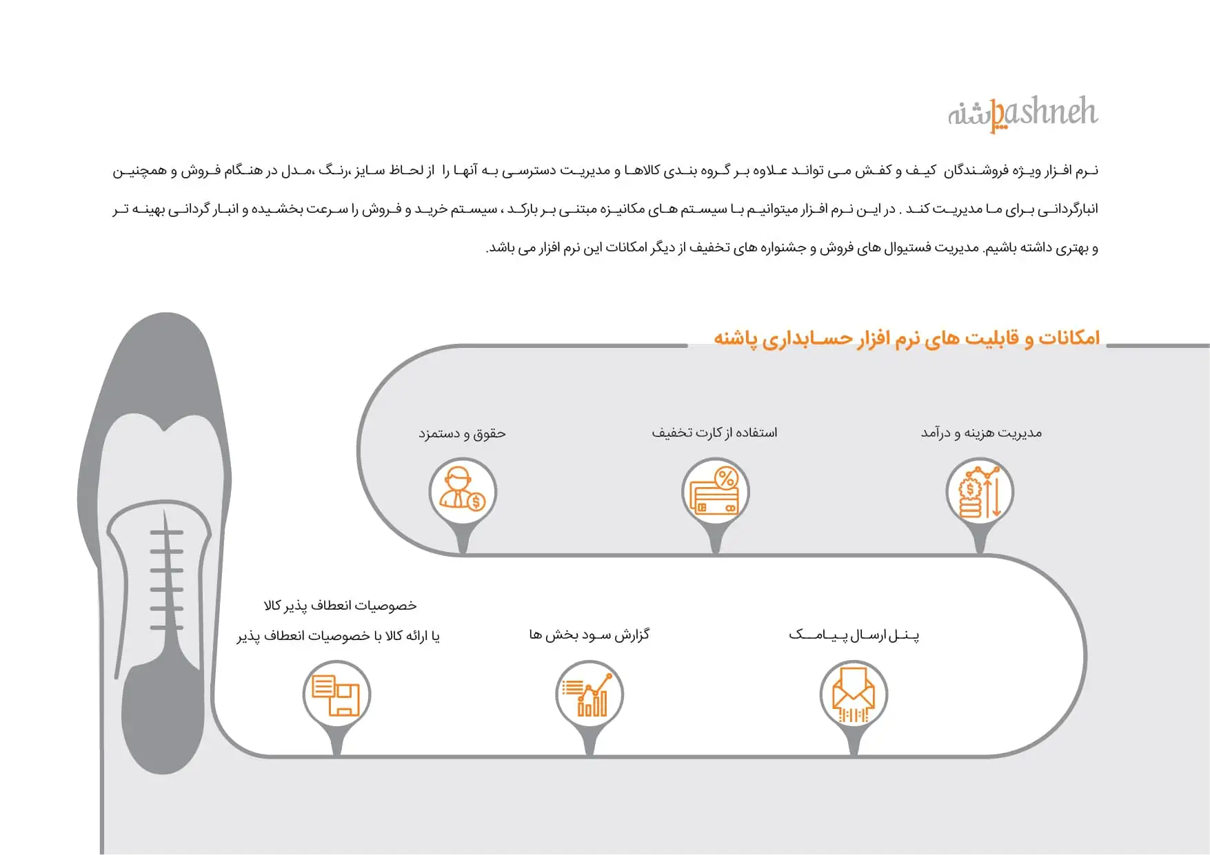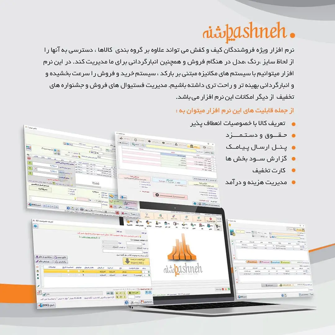 نرم افزار پاشنه برای فروشندگان کیف و کفش طراحی شده و در این نرم افزار بسیاری از قابلیت ها و امکانات اختصاصی شده این مشاغل پیاده سازی شده است.