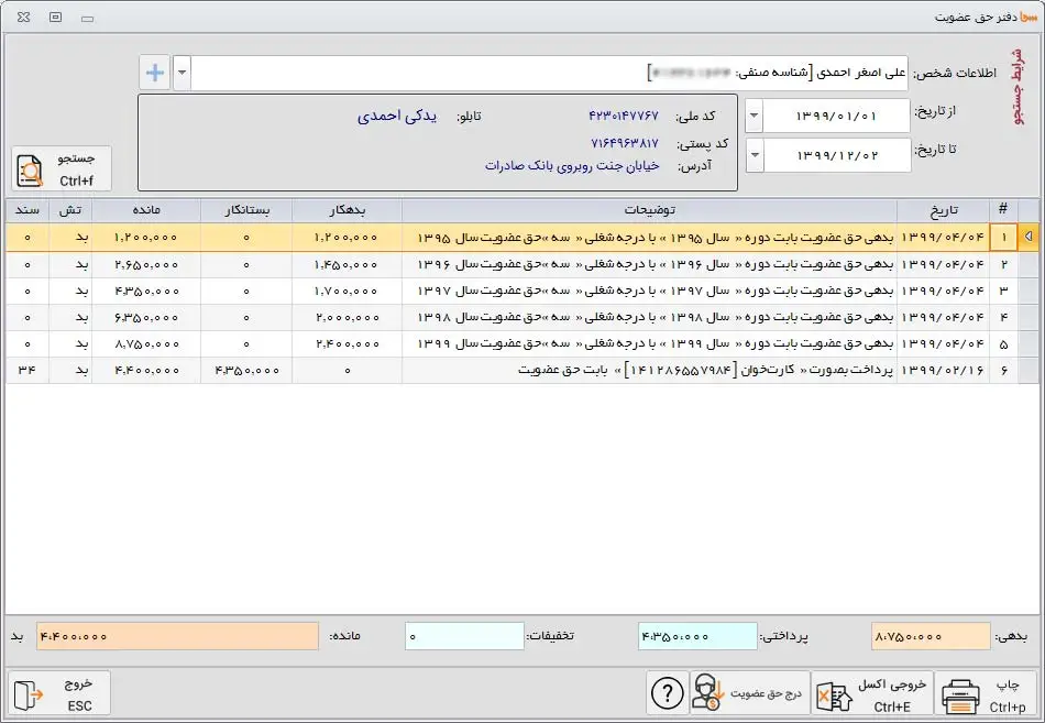 مشاهده ی پرداخت های اعضا به صورت یکپارچه با امکان تغییر شرایط جستجو