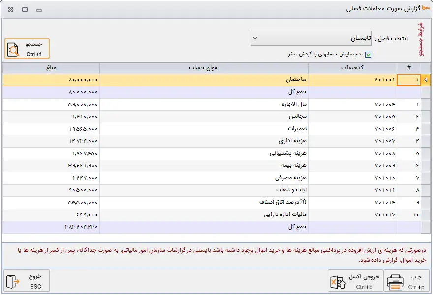 گزارش معاملات فصلی به تفکیک فصل و سرفصل های مربوطه