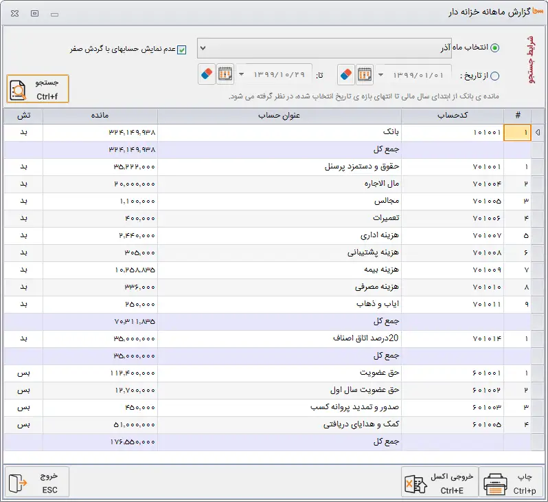 گزارش خزانه دار به تفکیک ماه و سرفصل های مربوطه