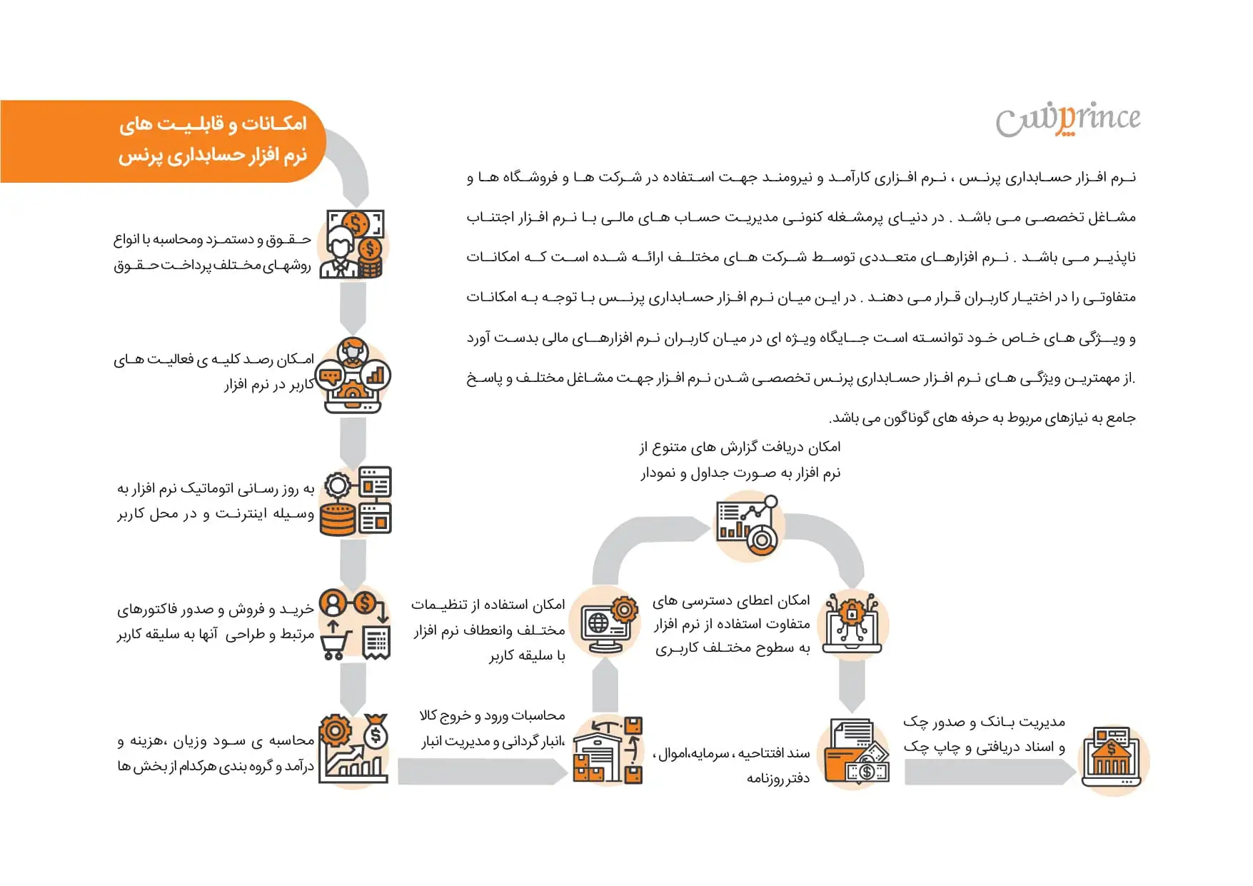 نرم افزار حسابداری فروشگاهی و شرکتی پرنس (پیشرفته)، علاوه بر دارا بودن تمام قابلیت های نرم افزار پرنس سطح استاندارد دارای امکانات و توانمندی های پیشرفته تری می باشد که به کاربر کمک می کند تا هم بتواند با جزئیات بیشتری اطلاعات را ثبت کند (امکان تعریف خصوصیت برای کالاها) و هم بتواند گزارش های دقیق تری را داشته باشد.