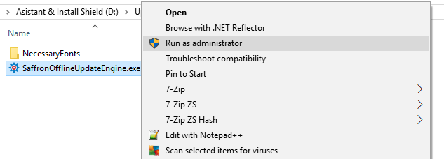 - بر روی فایل SaffronOfflineUpdateEngine.exe راست کلیک نمایید و بر روی گزینه Run As Administartor کلیک کنید.